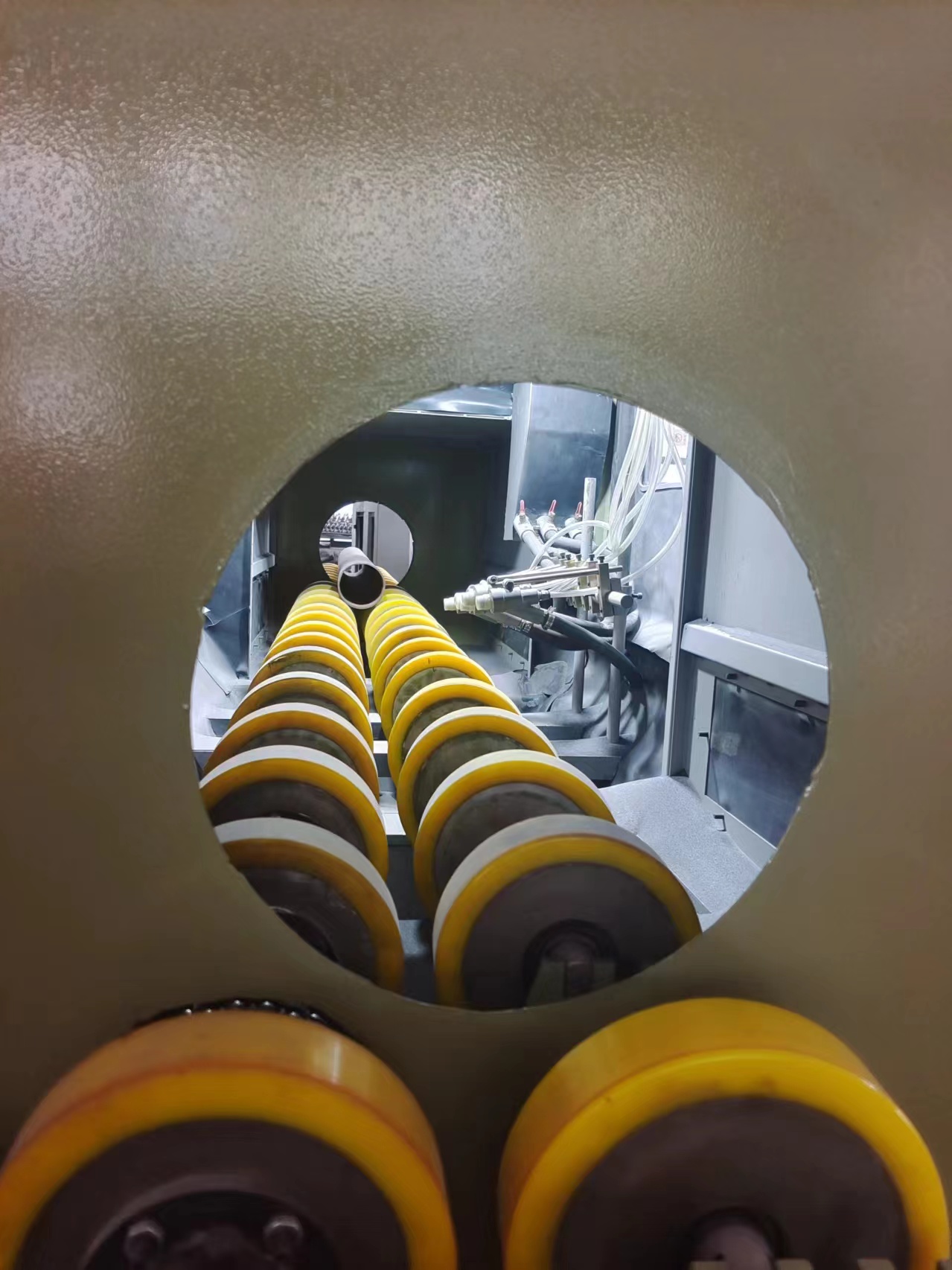 2、 本機(jī)采用輥軸旋轉(zhuǎn)帶動產(chǎn)品螺旋前進(jìn)電機(jī)變頻調(diào)速,控制加工速率;噴槍組